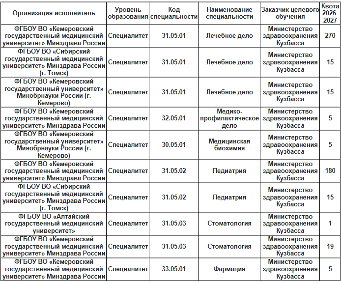 КВОТА ЦЕЛЕВЫХ мест Министерства здравоохранения Кузбасса на 2026 год