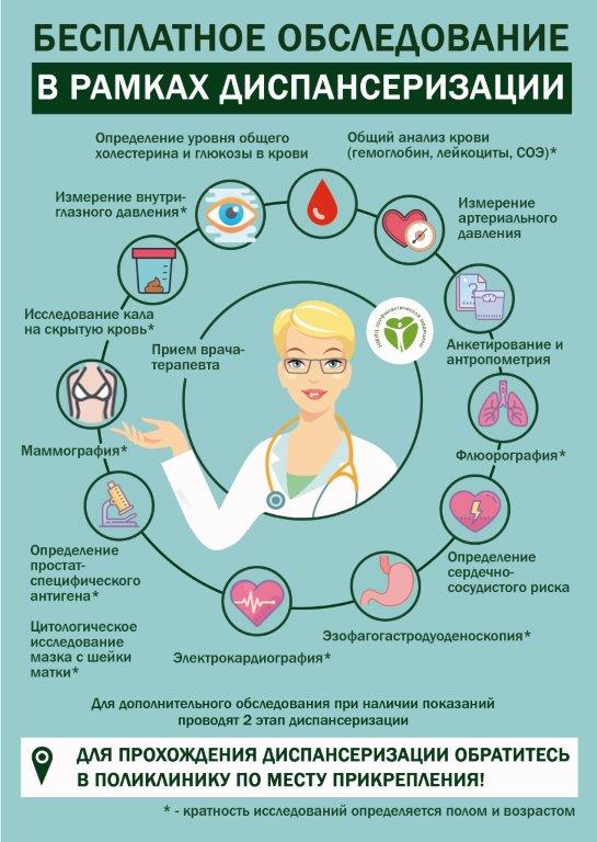 Диспансеризация позволит сохранить и укрепить здоровье, а при необходимости своевременно провести дополнительное обследование и лечение. Консультации врачей и результаты тестов помогут не только узнать о своем здоровье, но и получить необходимые рекомендации об основах здорового образа жизни или по выявленным факторам риска.